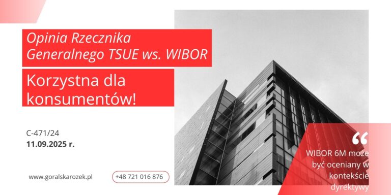 KORZYSTNE INFORMACJE DLA KREDYTOBIORCÓW ZŁOTOWYCH – WIBOR! RZECZNIK GENERALNY TSUE wydał dzisiaj bardzo korzystną opinię w sprawie C-471/24! To pierwszy tak poważny krok dla możliwości ochrony praw konsumentów-kredytobiorców złotówkowych Co powiedział Rzecznik? W telegraficznym skrócie: sądy krajowe mogą badać zgodność postanowień umownych przewidujących oprocentowanie zmienne oparte na wskaźniku referencyjnym WIBOR 6M z postanowieniami i celami […]