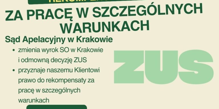 Wygrana w Sądzie z ZUS! W dniu 24 września 2025 r. Sąd Apelacyjny w Krakowie zmienił wyrok Sądu Okręgowego i przyznał naszemu Klientowi rekompensatę za pracę w szczególnych warunkach. Sprawa dotyczyła odmowy ZUS, który twierdził, że Klient nie spełnia warunków, w szczególności wymogu 15 lat pracy w szczególnych warunkach. Co to oznacza w praktyce i czym jest […]