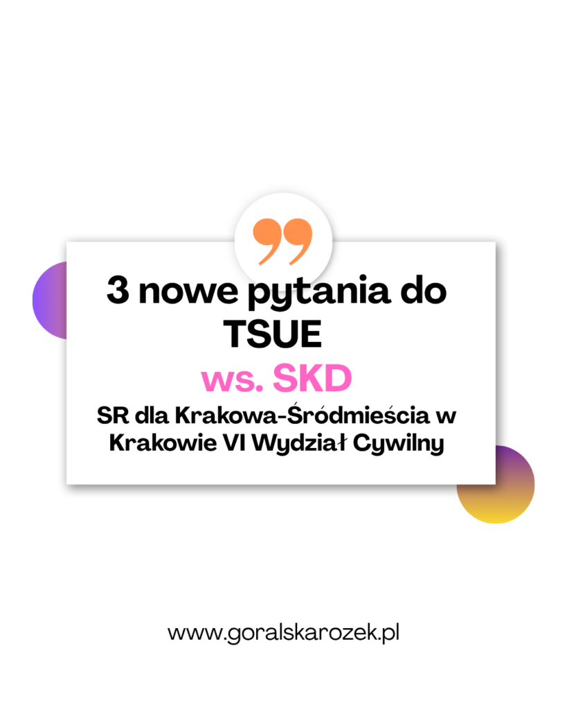 Drogą dostępu do informacji publicznej uzyskaliśmy informację, że 24 kwietnia 2026 r. Sąd Rejonowy dla Krakowa – Śródmieścia w Krakowie zadał 3 pytania prejudycjalne do TSUE ws. SKD. Jest to pokłosie i kontynuacja pytań w sprawie C-744/24. O co pyta Sąd?