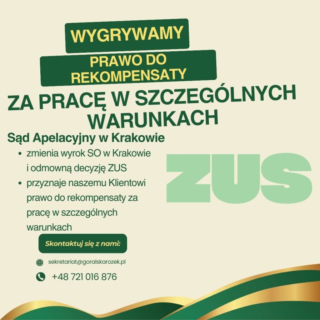 Wygrana w Sądzie z ZUS! W dniu 24 września 2025 r. Sąd Apelacyjny w Krakowie zmienił wyrok Sądu Okręgowego i przyznał naszemu Klientowi rekompensatę za pracę w szczególnych warunkach. Sprawa dotyczyła odmowy ZUS, który twierdził, że Klient nie spełnia warunków, w szczególności wymogu 15 lat pracy w szczególnych warunkach.
